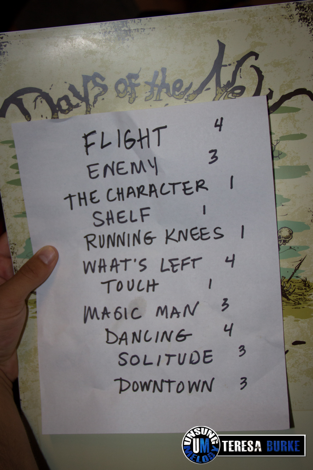 Travis quickly spoke to the rest of the band and they all left the stage. He mentioned it being a Days of the New tradition and played the majority of Dancing With the Wind from Days of the New (2001) alone on stage before the rest of the band came back out and joined him. They ended their set with two songs from the debut album, Solitude and The Down Town. Once they were finished, the band thanked the crowd, handed out set lists, picks, etc, waved good-bye and were gone. The hour and 20 minute kick off of the reunion tour had come to an end. When it was clear they were not coming back out, the crowd started chanting but alas, the show was over. Eventually, one by one, each band member came out to meet with fans, take photos, sign posters, CDs, set lists, etc.